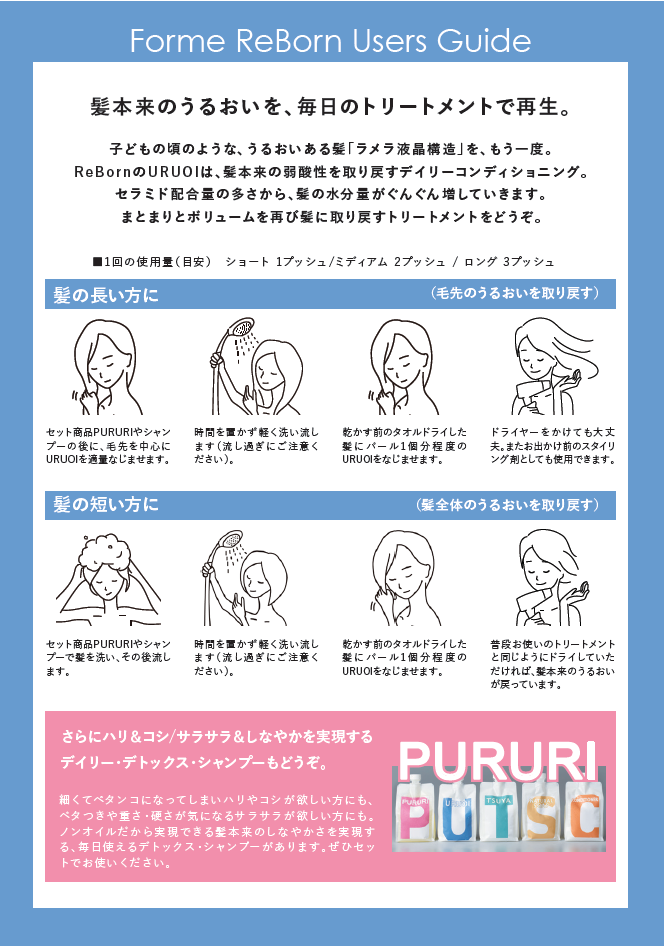 子どもの頃のような、うるおいある髪「ラメラ液晶構造」を、もう一度。 ReBornのURUOIは、髪本来の弱酸性を取り戻すデイリーコンディショニング。